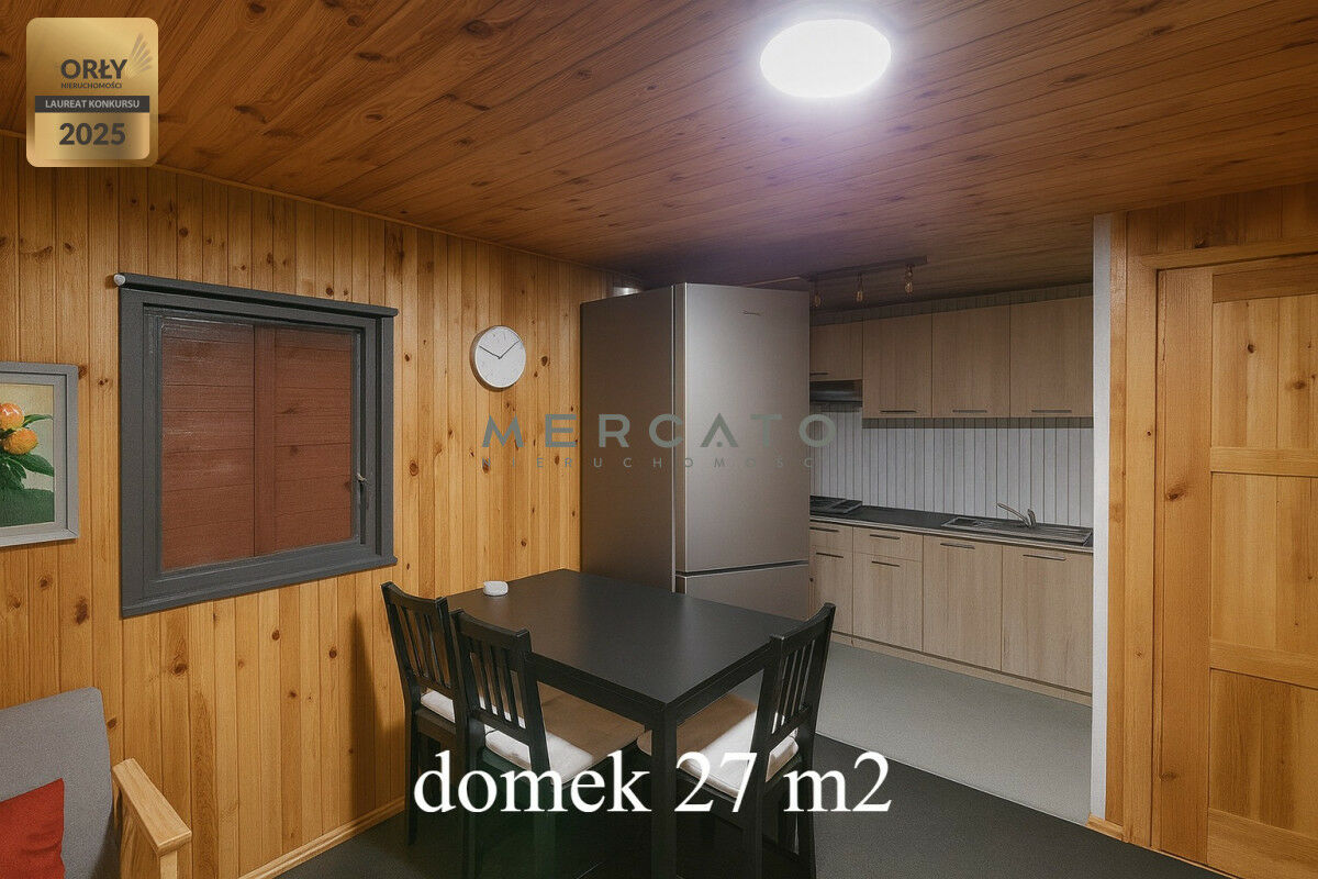 Zabudowania: Na każdej z dwóch ewidencyjnych działek stoi drewniany domek letniskowy - jeden o pow. ~27 m², drugi ~36 m². Układ każdego domku jest zbliżony: salon z aneksem kuchennym, 2 sypialnie, łazienka. Domki są w dobrym stanie technicznym - regularnie konserwowane (impregnacja drewna itp.), wszystkie instalacje sprawne. Przy każdym domku przygotowano miejsce do grillowania. Dodatkowo na posesji znajduje się drewutnia (składzik na drewno) oraz schowek na narzędzia/ sprzęty ogrodowe.